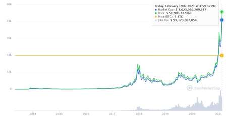 Bitcoin (BTC) atingiu seu maior preço da história hoje, de US$ 55 mil; valor de mercado do ativo bate US$ 1 trilhão